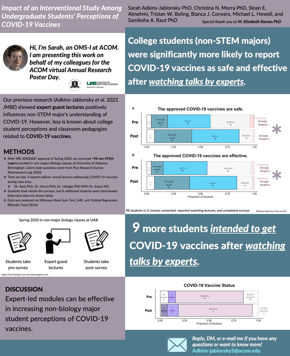 University of Alabama at Birmingham Students in two concurrent non-major biology courses (n=156) in Spring 2021 completed Likert questionnaires and reflections prior to and after an educational intervention addressing vaccine-related concerns. In the module, experts gave presentations about COVID-19 related to microbiology, epidemiological factors, and personal experiences of COVID-19. One class of students completed a podcast-based service-learning project tasked with countering a vaccine misconception. Eight students agreed to participate in post-semester one-on-one interviews.